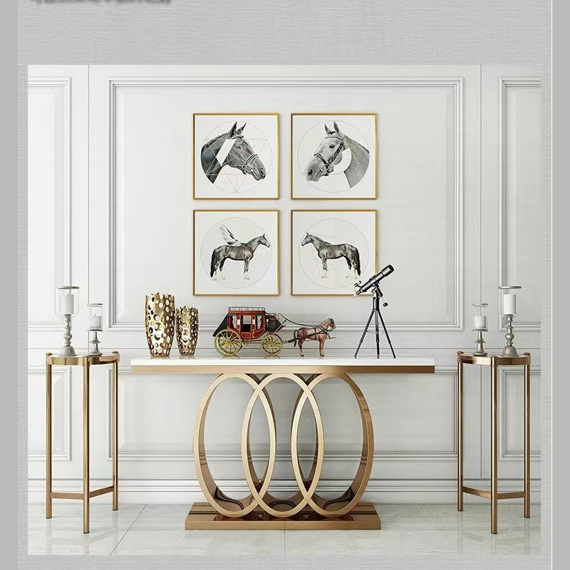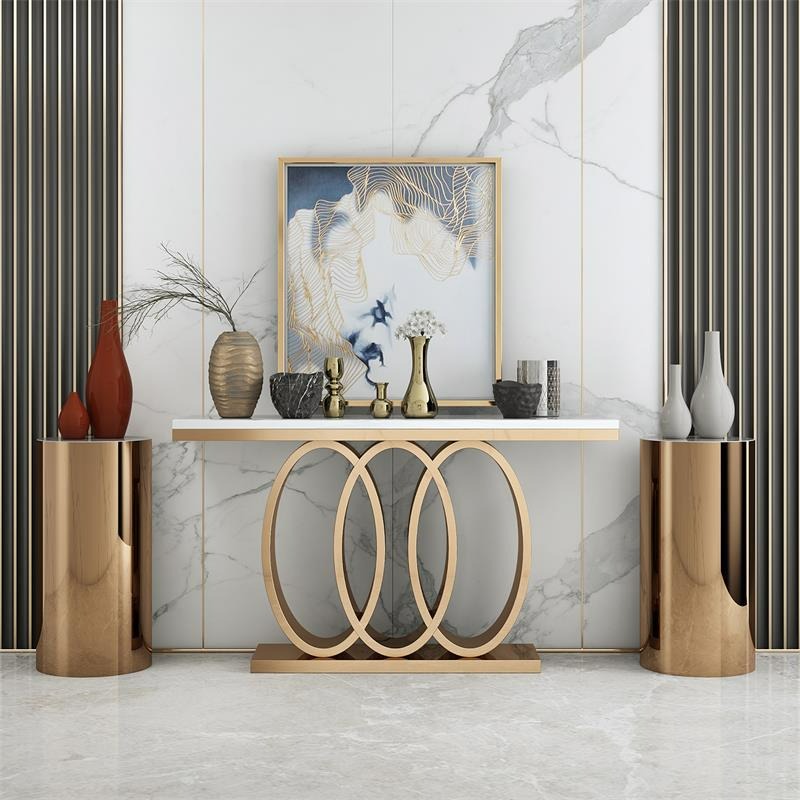 Bàn console không chỉ giúp bạn tận dụng tối đa không gian, mà còn là một món đồ trang trí không thể thiếu trong không gian phòng khách. Khi đặt chiếc bàn console cao cấp này ở những vị trí như gần cửa ra vào, trong hành lang hoặc đối diện với ghế sofa, bạn sẽ ngay lập tức tạo được sự chú ý và thu hút ánh nhìn. Với sự kết hợp của màu vàng từ hợp kim mạ vàng và các tông màu sáng của đá, chiếc bàn console này mang lại vẻ đẹp quý phái và thanh thoát cho không gian phòng khách của bạn, đồng thời tạo ra sự cân bằng giữa các món đồ nội thất khác trong phòng.