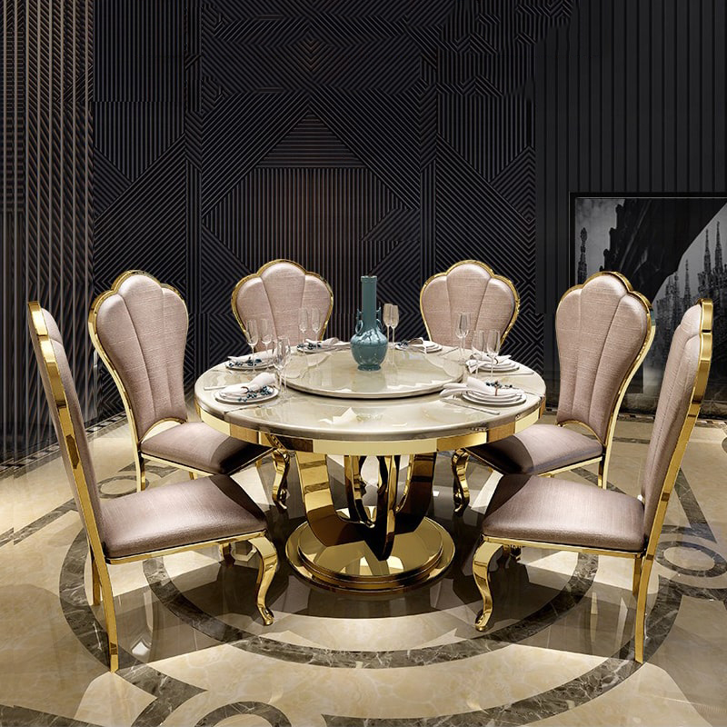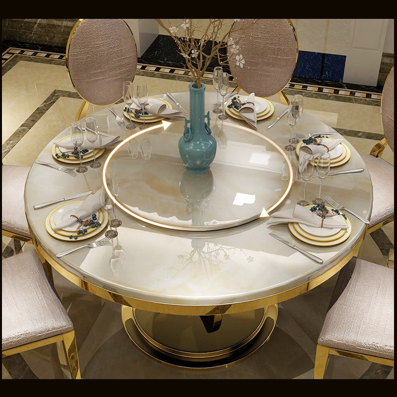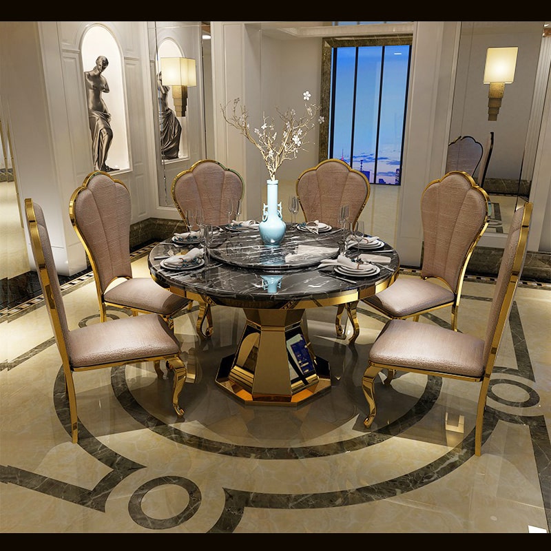 Chất liệu đá hoa cương và hợp kim mạ vàng giúp bộ bàn ăn này không chỉ trở thành điểm nhấn trong phòng ăn mà còn tạo ra một không gian thanh thoát, đầy sự thịnh vượng và may mắn cho gia chủ.