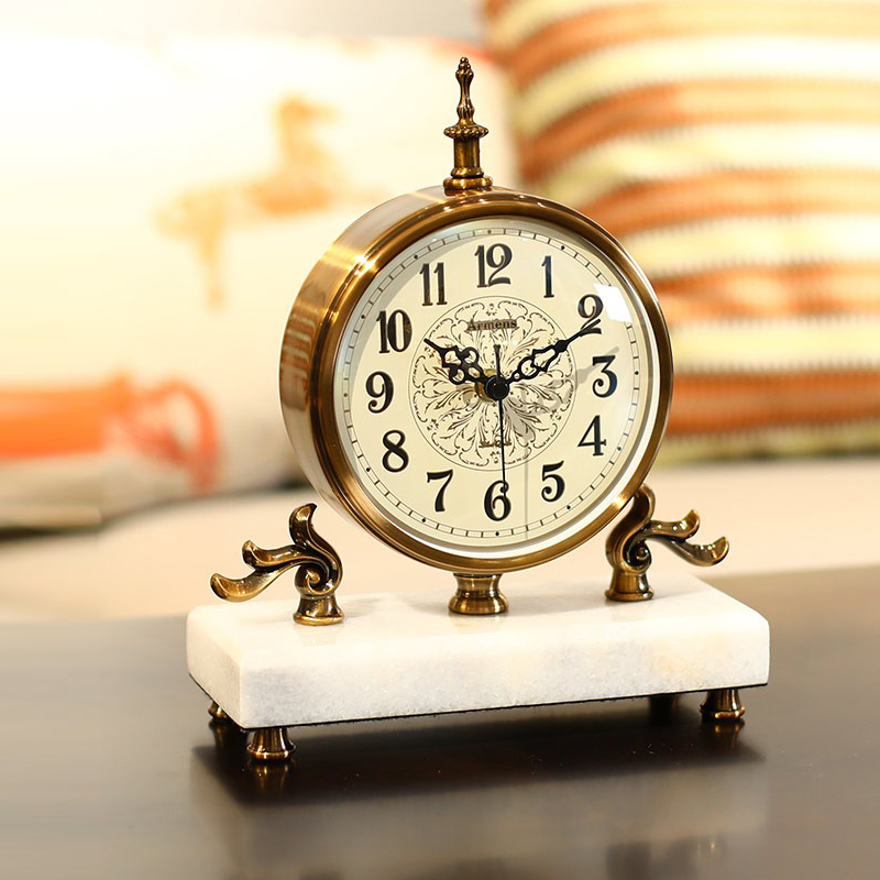 Chất liệu mạ đồng và đá cẩm thạch không chỉ mang lại vẻ đẹp mà còn tạo cảm giác vững chãi và quyền quý cho không gian. Mỗi lần nhìn vào đồng hồ để bàn cổ điển, gia chủ sẽ cảm nhận được sự thanh thoát và kiên trì trong cuộc sống.