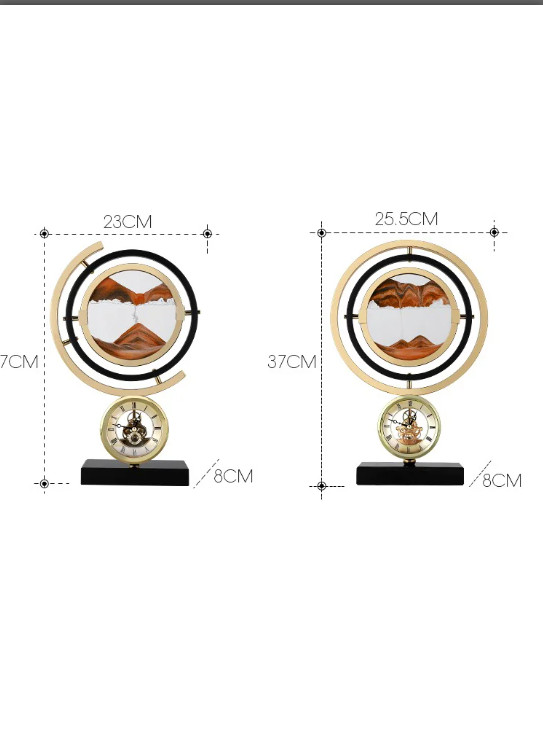 Đồng hồ để bàn kết hợp tranh cát sáng tạo từ Decor Hà Nội là sự kết hợp hoàn hảo giữa chất liệu kim loại, thủy tinh kính và tranh cát lún pha lê. Với kích thước D23cm x R8cm x C37cm (nhỏ) và D30.5cm x R10cm x C43cm (lớn), sản phẩm này phù hợp với nhiều không gian khác nhau, từ phòng khách, phòng làm việc đến các không gian nhỏ hơn như bàn học, kệ sách. Mỗi chiếc đồng hồ được chế tác tỉ mỉ, với từng chi tiết nhỏ được hoàn thiện kỹ lưỡng, mang lại một sản phẩm không chỉ đẹp mà còn rất bền bỉ.