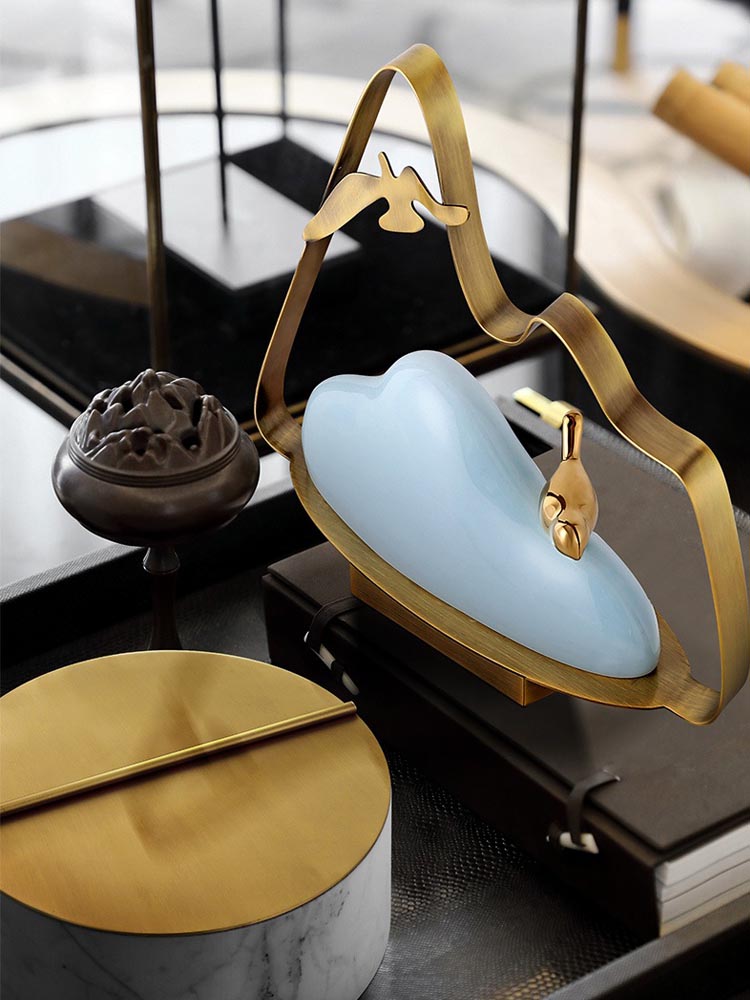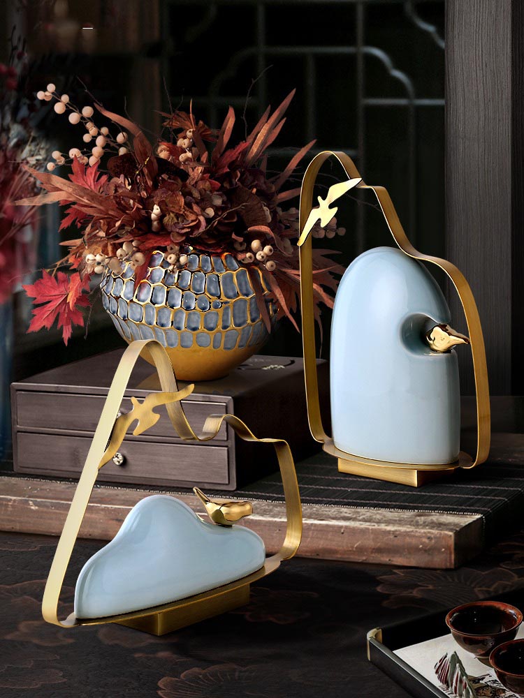 Với thiết kế Trung Hoa mới, mô hình trang trí bằng gốm để bàn này có thể làm nổi bật bất kỳ không gian nào. Phong cách Trung Hoa hiện đại, kết hợp với màu sắc tinh tế của gốm sứ và kim loại, giúp không gian trở nên hài hòa và đầy nghệ thuật.