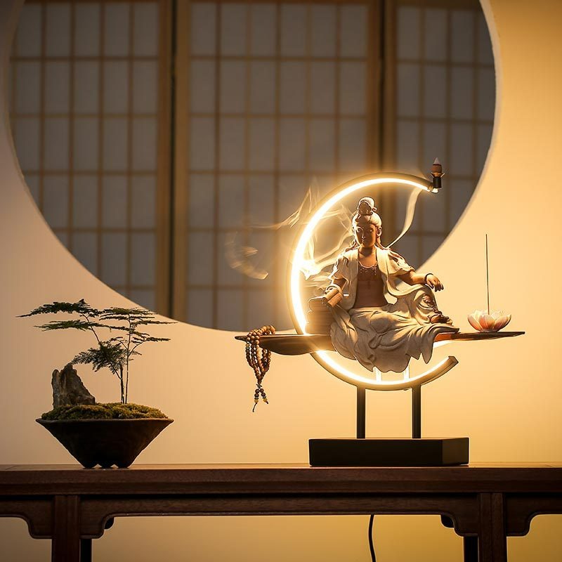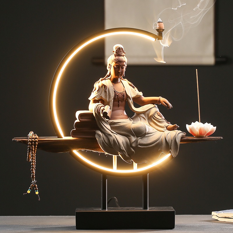 Tượng Quan Âm ngồi trên trăng từ Decor Hà Nội giúp gia chủ thu hút tài lộc và may mắn. Hình ảnh Phật Quan Âm mang lại sự từ bi và trí tuệ, giúp gia chủ thu hút những cơ hội tốt trong công việc và cuộc sống. Sự kết hợp với thác khói trầm hương phong thủy sẽ làm sạch không khí, tạo không gian trong lành và giúp thu hút năng lượng tích cực và tài lộc vào không gian sống của bạn.