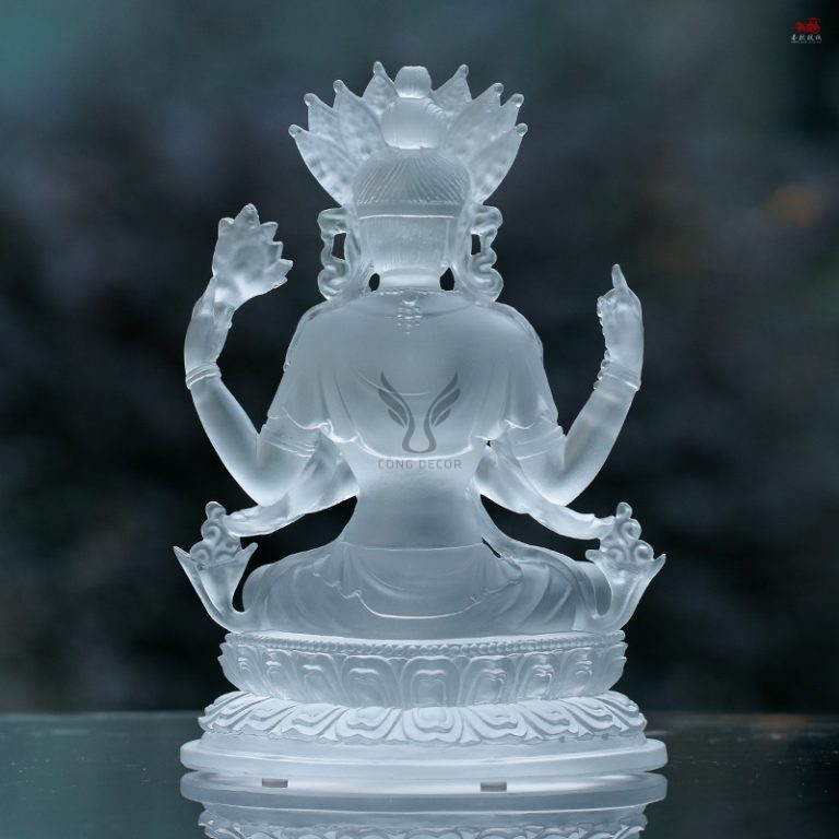 Tượng Phật Quan Âm Bồ Tát được chế tác từ chất liệu lưu ly cao cấp, mang lại vẻ đẹp tinh tế và bền bỉ. Chất liệu này giúp tượng có độ sáng bóng, dễ dàng vệ sinh và bảo quản, đồng thời mang lại giá trị phong thủy lâu dài.