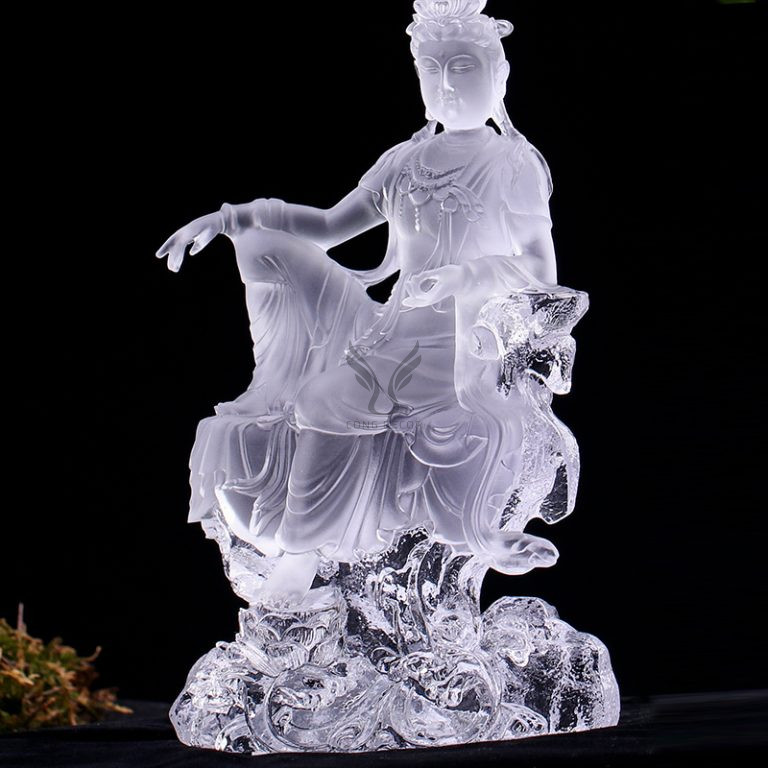 Tượng Phật Quan Thế Âm Bồ Tát được chế tác từ chất liệu lưu ly cao cấp, mang lại vẻ đẹp sang trọng và bền bỉ. Chất liệu này không chỉ giúp tượng có độ sáng bóng mà còn đảm bảo độ bền cao, dễ dàng vệ sinh và bảo quản.
