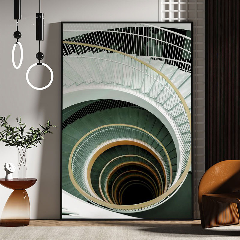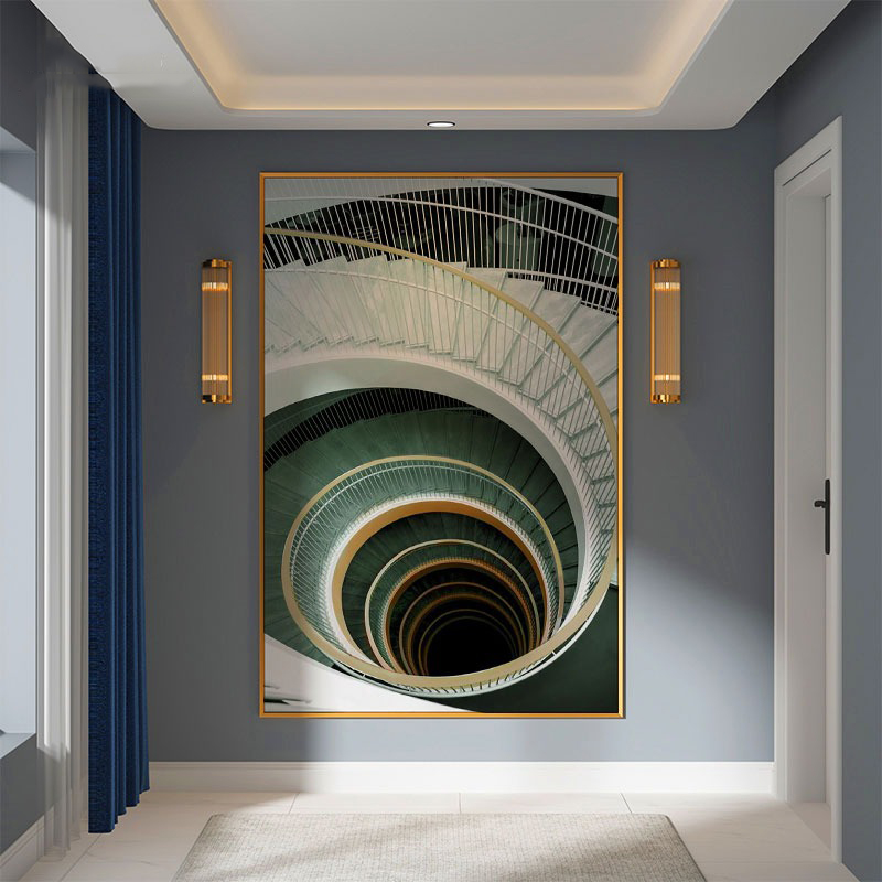 Tranh in sơn dầu xoáy cầu thang từ Decor Hà Nội mang đến một thiết kế cực kỳ ấn tượng và tinh tế. Đặc biệt, hình ảnh xoáy cầu thang trong tranh không chỉ thể hiện một sự chuyển động mạnh mẽ mà còn mang lại cảm giác về sự thăng tiến, phát triển không ngừng. Đây là hình ảnh mang đậm ý nghĩa phong thủy, giúp gia chủ thu hút may mắn, tài lộc và thịnh vượng vào không gian sống của mình.