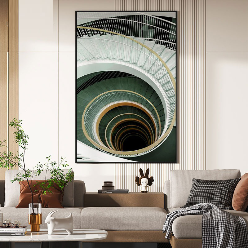 Tranh in sơn dầu xoáy cầu thang treo tường phòng khác vừa đẹp mắt vừa giúp phòng khách thêm hiện đại