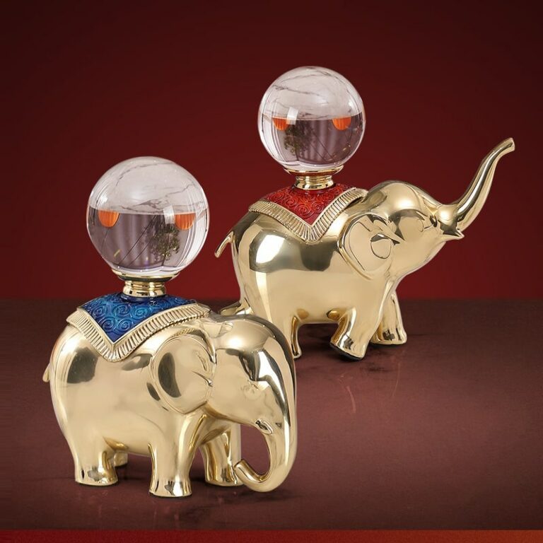 Trong phong thủy, voi là biểu tượng của trí tuệ, quyền lực và sức mạnh. Voi đồng được xem như một linh vật mang đến sự vững vàng, ổn định và bền bỉ. Kết hợp với quả cầu pha lê, tượng voi không chỉ thu hút năng lượng tích cực mà còn đại diện cho sự minh triết và sự phát triển hài hòa.